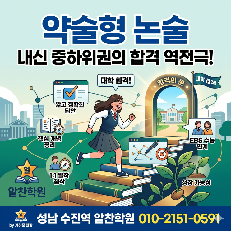 안녕하세요, 성남 수진역 알찬학원입니다! 수시를 준비하는 학생들과 학부모님들을 상담하다 보면 이런 고민을 정말 많이 듣습니다. "내신이 애매한데 수시에서 쓸 카드가 있을까요?" "논술은 상위권 학생들만 하는 전형 아닌가요?" "저는 논술이랑 상관없어요." "글을 잘 쓰는 학생들만 하는 거 아닌가요?" "내신도 애매하고 수능도 불안한데, 논술까지 할 수 있을까요?" 그런데 정말 그럴까요? 최근 대입에서 주목해야 할 전형 중 하나가 바로 약술형 논술입니다. 약술형 논술은 기존의 인문논술이나 자연논술과는 성격이 완전히 다릅니다. 핵심은 간단합니다. 긴 글보다 → 정확한 답....... <img src="https://blogthumb.pstatic.net/MjAyNjA0MjVfMTc5/MDAxNzc3MTI3MjM0Njc3.HVMpPYONd5ZOXyd9UF5_wABe7rJig49FMy2TTO7B_Gwg.G6H3ZCwxcGOYbBh5bYjQzrHbIpkjf6x0sL5zVctLJsMg.PNG/Gemini_Generated_Image_ifh37kifh37kifh3.png?type=s3" />