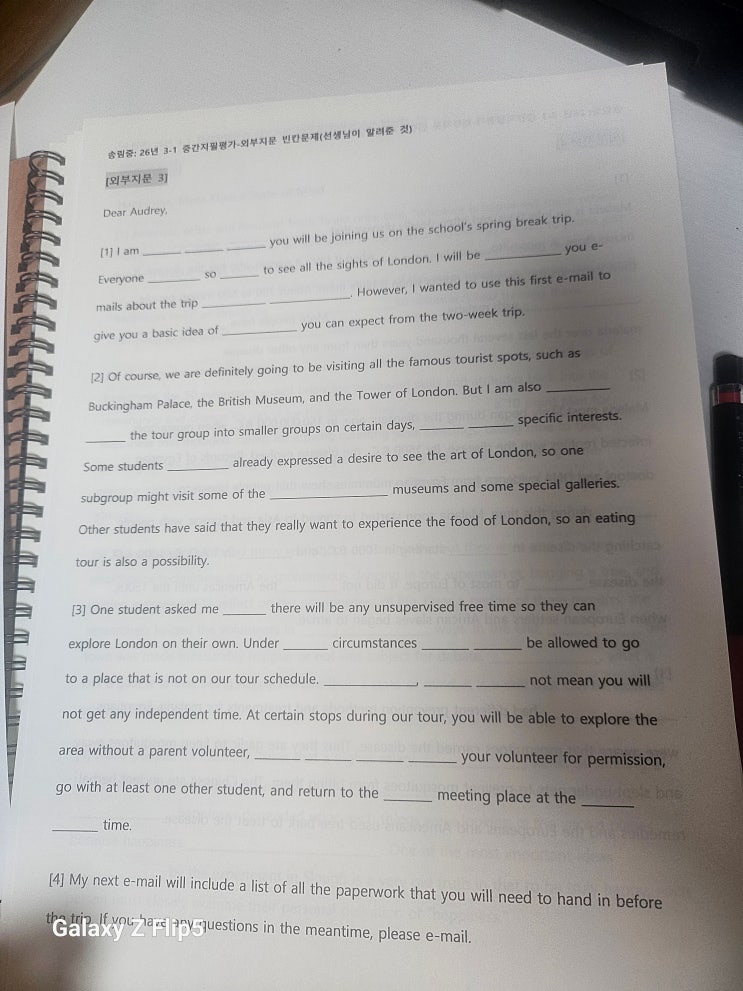송림중 3학년 영어 중간고사 대비, 외부지문 4개까지 빈칸문제로 완벽 정리