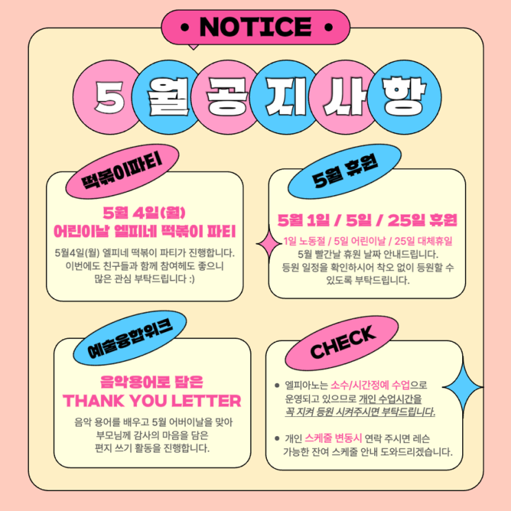 안녕하세요 목련음악학원입니다^^ 아이들이 저에게 생일 카드들을 줬어요! 제 생일 때마다 받는 선물들 때문에 항상 감동을 받는 중인데요ㅠ 오늘도 받은 선물들을 자랑을 해보려 합니다 라희와 서이라는 학생들이 카드를 써준 건데요~ 상황이 너무 귀엽고 감동적이었어요 ㅎㅎ 라희가 먼저 "선생님 생신 언제예요?" 해서 제가 "19일" 이러니까 바로 둘이 몰래 무언가를 열심히 만들고 쓰더라고요~ 그러면서 제가 보는 거 같을 때마다 아이들이 "선생님 제 친구도 선생님이랑 생일이 똑같고 고양이도 있어요 신기하죠?"라고 서프라이즈를 준비하더라고요~ 바로 눈치를 챘지만 아이들의 그 착한 마음씨가 너무....... <img src="https://blogthumb.pstatic.net/MjAyNjA0MTVfMTUg/MDAxNzc2MjQwMjIyOTA0.94Gt6nwfHzM0XGOM6kR9g9ULWPf8z9WWxuGW6pF_gz8g.dO_dylVQB7kjNWXOw44XZplLgJn0OC90C0VCgYnEGkwg.JPEG/IMG%A3%DF0502.jpg?type=s3" />