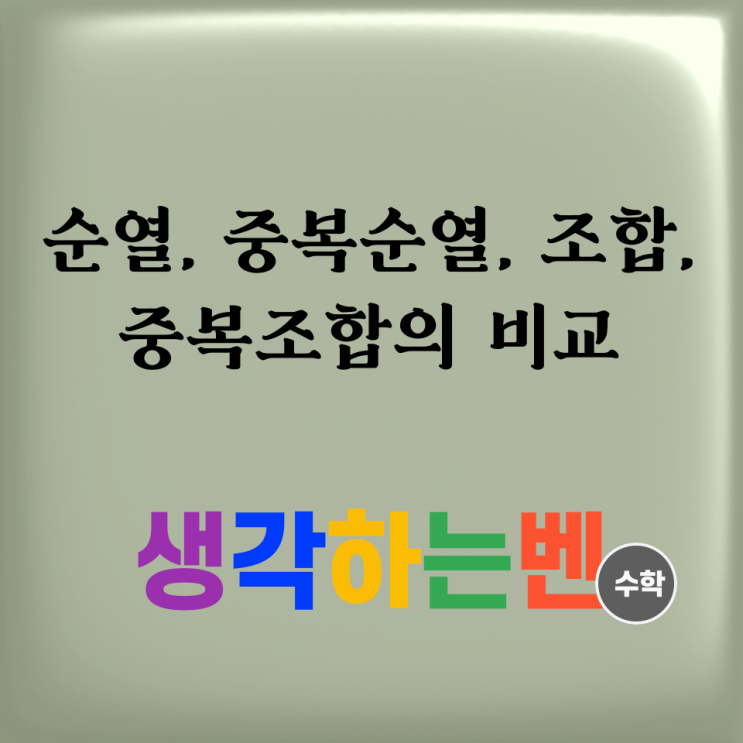 덕소 수학학원 생각하는벤 인간의 삶은 선택과 배열의 연속입니다. 아침에 어떤 옷을 입을지, 점심에 무엇을 먹을지, 혹은 친구들과 여행을 갈 때 좌석을 어떻게 배치할지까지, 우리는 끊임없이 경우의 수를 따지고 있습니다. 이러한 문제를 단순히 직관에 의존해 해결할 수도 있지만, 수학은 이를 체계적으로 분석할 수 있는 도구를 제공합니다. 특히 순열과 조합은 경우의 수를 계산하는 가장 기본적이고 중요한 개념으로, 단순한 공식 이상의 의미를 지닙니다. 이는 논리적 사고를 훈련시키고, 복잡한 상황을 구조적으로 이해하는 능력을 길러줍니다. 【순열, 중복순열, 조합, 중복조합의 비교】 ▶ 순열, 중복순열, 조합, 중복조합의 관계 ▶....... <img src="https://blogthumb.pstatic.net/MjAyNjA0MjhfNzgg/MDAxNzc3Mzc1MDQwOTgy.3GcAJd2sNMAUoBtPtPV2vGGXeAMbvphVJ_W_bogzzP0g.G32mN3mAV4RwwrTZWxjOHSvmQpAsqCwWJ6HoKgAqf_Qg.PNG/%C1%A6%B8%F1%C0%BB-%C0%D4%B7%C2%C7%D8%C1%D6%BC%BC%BF%E4__%BA%B9%BB%E7%BA%BB-001_%2817%29.png?type=s3" />
