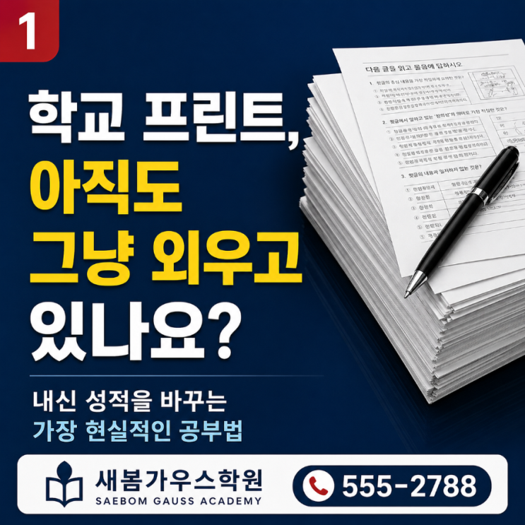 다산동 수학학원 새봄가우스학원 입니다. 내신 성적을 바꾸는 가장 현실적인 공부법 내신 시험이 다가올수록 학생들이 가장 많이 쌓는 것이 있습니다. 바로 학교 프린트와 유인물입니다. 해설집도 없고, 시중에서 구할 수도 없는 자료들. 선생님이 직접 만든 만큼 시험에 가장 가깝지만, 막상 공부하려고 하면 어디서부터 시작해야 할지 막막합니다. 그래서 많은 학생들이 선택하는 방법은 단순합니다. 그냥 반복해서 외우는 방식입니다. 하지만 이 방법은 시간 대비 효율이 매우 낮습니다. 외우는데도 성적이 오르지 않는 이유 문제는 노력의 양이 아니라 방법입니다. 단순 암기는 쉽게 잊히고 시험장에서 떠올리기 어렵고 서술형 문제에서 무너....... <img src="https://blogthumb.pstatic.net/MjAyNjA0MjVfMTUx/MDAxNzc3MTI2MTk3MzI2.cKh89tuINrZz0JRvZVxRHe58SOL3_F4yu-WS5kY5OvYg.9JdDB8-GMONVopNotbm01Z76dxDnGbg6hT2LMMGRtN8g.PNG/900%A3%DFfile%A3%DF00000000ed647209966e146be89ff1c3.png?type=s3" />