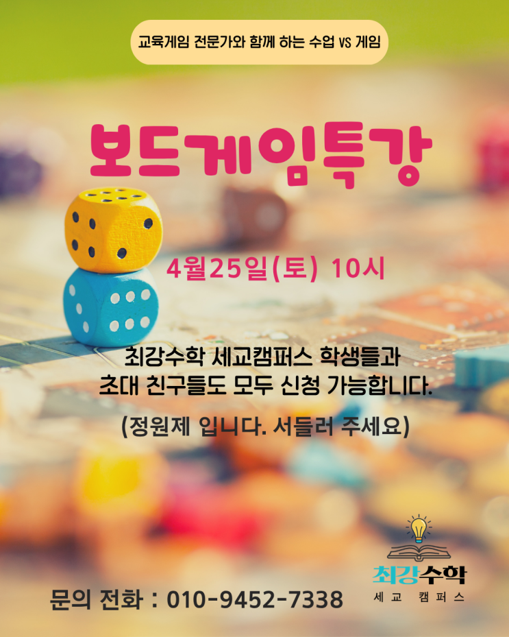 보통 수학학원 하면 어떤 이미지가 떠오르시나요? 문제집을 풀고, 설명을 듣고, 다시 문제를 푸는 반복… 하지만 궐동수학학원 최강수학 세교캠퍼스 에서는 조금 다른 방식으로 아이들을 만나고 있습니다 이번 주말, 초등학생 친구들과 함께 특별한 보드게임 수업을 진행했는데요, 단순한 ‘놀이’가 아닌 아이들이 스스로 생각하게 되는 ‘수업’이었습니다. 이번 수업은 주말 1회 체험형 특강으로 진행되었습니다. 아이들이 부담 없이 참여하면서도 학습적인 효과까지 느낄 수 있도록 구성했어요. 처음에는 “게임이라서 좋다!”라는 반응으로 시작했지만, 시간이 지날수록 점점 더 집중하는 모습이 인상적이었습니다. 동수학학원 최강수....... <img src="https://blogthumb.pstatic.net/MjAyNjA0MjVfNDAg/MDAxNzc3MTE3NzkwMTI1.jngMxmiIQKvISn4SzhhFooMrsYZtDP_4io08yGl7szog.ugL-83ZU0Z4Aa_o7UHAkMlar0vE_N1FIuHWFgkyA5WQg.PNG/%C7%CE%C5%A9%BB%F6_%BB%A1%B0%A3%BB%F6_%B1%CD%BF%A9%BF%EE_%BF%A9%B8%A7_%B9%E6%C7%D0_%BE%C8%B3%BB_%C0%CE%BD%BA%C5%B8%B1%D7%B7%A5_%B0%D4%BD%C3%B9%B0.png?type=s3" />