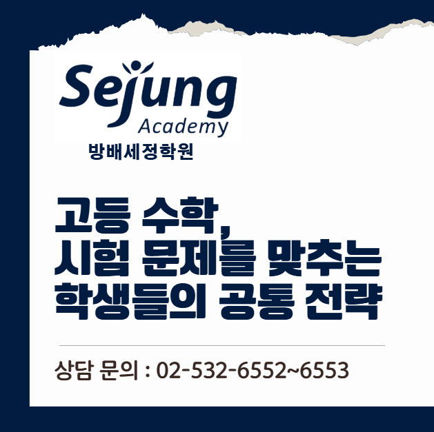 안녕하세요. 진정한 교육, 준비된 세정. 동덕여고수학학원 방배세정학원입니다. 고등 수학 시험이 끝나면 같은 반에서도 성적 차이가 크게 벌어지는 모습을 자주 보게 됩니다. 같은 수업을 듣고 비슷한 문제집으로 공부했음에도 불구하고, 어떤 학생은 안정적으로 점수를 확보하고, 어떤 학생은 아쉬운 결과를 받습니다. 그렇다면 시험 문제를 꾸준히 맞추는 학생들의 공통 전략은 무엇일까요? 그 차이는 단순한 문제풀이 양이 아니라, 시험을 대하는 방식과 학습 구조에서 시작됩니다. 첫 번째 공통점은 문제를 풀기 전에 ‘읽고 정리하는 습관’입니다. 상위권 학생들은 문제를 보자마자 계산에 들어가지 않습니다. 조건을 먼저 정리하고, 무엇....... <img src="https://blogthumb.pstatic.net/MjAyNjA0MjNfMjUx/MDAxNzc2OTA5ODcyMDE2.Pev6jTsTh1gGmSMVr-PzrvvxYhGmvCTP2wv2CPO4DyMg.WZpSaQehv3Y19J1a9cNA4Cy47jW3uk0CvFUkjNdj7Gwg.PNG/image.png?type=s3" />