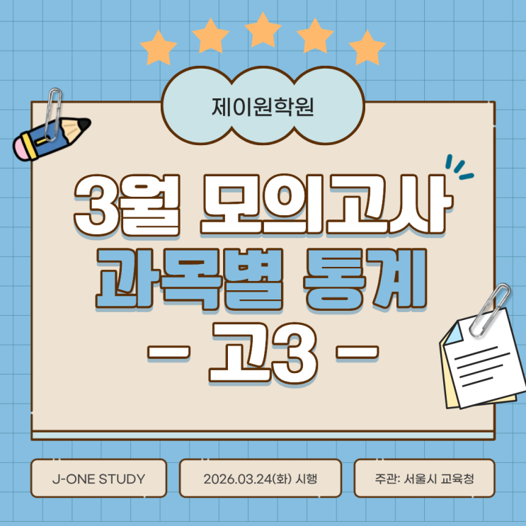안녕하세요. 수원입시전문 제이원학원입니다. ♀️♂️ 26년 3월 24일(화) 시행된 고3 3월모의고사 등급컷/평균점수/ 표준편차 등급비율 안내 드립니다. (출처: 서울시교육청) 고1 3월모의고사 결과는 하단 링크 참고 부탁드립니다. 고2 3월모의고사 결과는 하단 링크 참고 부탁드립니다 고3 3월모의고사 과목별 평균점수/응시인원/표준편차 고3 3월모의고사 영어 등급별 비율 고3 3월모의고사 표준점수에 의한 등급구분 점수 [국어/수학] 고3 3월모의고사 국어/수학 표준점수 최고점 고3 3월모의고사 표준점수에 의한 등급구분 점수 [사탐] 고3 3월모의고사 표준점수에 의한 등급구분 점수 [과탐....... <img src="https://blogthumb.pstatic.net/MjAyNjA0MjVfMjky/MDAxNzc3MDg4NTkwNzMw.gBkXR0gdtlWy7kcg4VbsWEvsbKMCklxq1d8tyInl_WUg.77WgWkaq2cQUcPW3qVAmTRJoSHNmKdChfXFU3wI0jHgg.PNG/1.png?type=s3" />