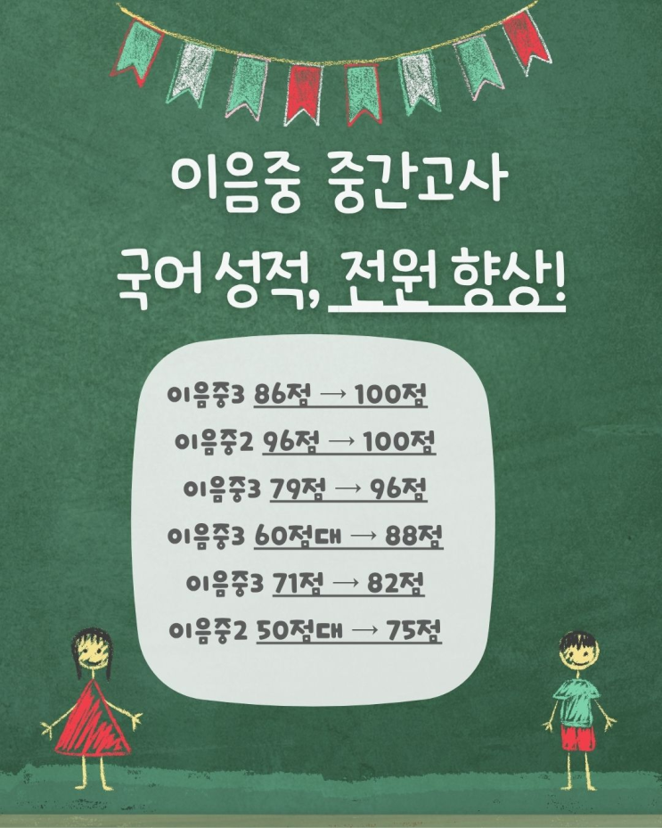 이음중 중간고사 결과가 나왔습니다. 놀라운 소식입니다. 지난번 시험 점수보다 모두 성적이 올랐습니다. 86점 → 100점 96점 → 100점 79점 → 96 60점대 → 88점 71점 → 82점 50점대 → 75점 한 명의 결과가 아니라 모든 학생이 함께 성장했다는 점에서 더욱 의미 있는 결과였습니다. 시험이 끝나자마자 100점을 찍어 보내온 아이, 전화를 걸어 상기된 목소리로 이야기하던 아이도 있었습니다. 또 어떤 아이는 한달음에 달려와 시험지를 제 손에 꼭 쥐여주기도 했고, 아쉬운 실수를 했다며 스스로를 돌아보는 모습도 볼 수 있었습니다. 사실 이 결과는 단기간에 만들어진 것이 아닙니다. ▶ 겨울방학 동안에는 몰입 독서를 중심으로 지문의 흐....... <img src="https://blogthumb.pstatic.net/MjAyNjA0MjhfMTI3/MDAxNzc3MzQxOTI5NzMx.y2w9I9GT4ONJVa_fT0Sqnn0uAgzHDUHbHyngB9LcoK4g.V6AHhGn6nXJlS08lPhXoE2JDPyjtYV2fGpBA4KZlQnUg.PNG/image.png?type=s3" />