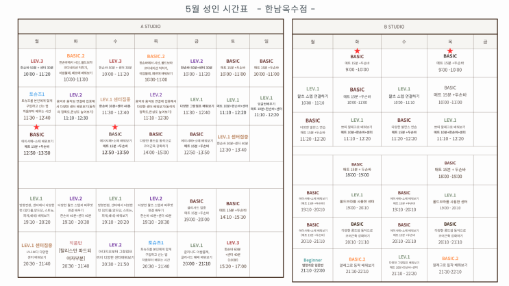 발레포러스 한남옥수점 / 5월 시간표