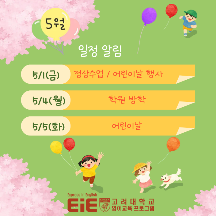 안녕하세요~ 가정의 달 5월 휴무일을 안내드립니다. 5월 1일은 정상수업(Monthly Test)이 진행되며 푸드트럭행사 및 Prep시간에 카드쓰기 행사가 있습니다. 5월 4일은 1일을 대체하는 휴무일이며, 5월 5일은 어린이날 법적 공휴일 입니다. 따뜻한 가정의 달 뜻깊은 나날 보내시고 5월 6일 수요일에 정상 등원 할 수 있도록 협조 부탁드립니다^^ <img src="https://blogthumb.pstatic.net/MjAyNjA0MjhfNjAg/MDAxNzc3MzU1NDUxODc3.W363AKbtuQMmBUFz8Z0IVwO9_Q5Ued8NZD7bWnCLocMg.LY4_He_i4SNrBY7GVZNN00tOfKsB88M0vkCF2FlMGiMg.PNG/5%BF%F9_%C8%DE%B9%AB%BE%C8%B3%BB.png?type=s3" />