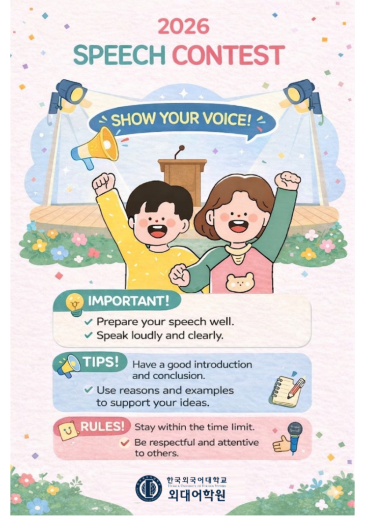 안녕하세요, 외대어학원입니다. 따사롭고 화려한 벚꽃이 만개한 봄을 즐기고 있나 싶었는데, 어느덧 초여름을 닮은 더위가 찾아오고 있습니다. 오늘은 북동탄 외대어학원의 대표 행사이자 학생들이 영어로 자신감을 키워가는 특별한 무대인 Speech Contest 후기와 함께 용인외대부고 탐방 소식, 그리고 6월에 예정된 입시설명회 안내까지 전해드리겠습니다. 1️⃣ Speech Contest 후기 2️⃣ 용인외대부고 탐방 안내 합격 이후에도 이어지는 인연 3️⃣ 입시 설명회 안내 1️⃣ 성장의 시작, Speech Contest 후기 북동탄 외대어학원은 매년 봄학기마다 Speech Contest를 개최하여 학생들이 영어로 자신의 생각을 표현할 수 있는 소중한 기회....... <img src="https://blogthumb.pstatic.net/MjAyNjAzMzBfMjcy/MDAxNzc0ODUzMzQzNjA5.G1CYJMERp-2GnQ5_E9-pOu36o1o7jCKpICbJ2akf558g.as_8LlG7JjbbzjubknKelousANlS3xqhrmHVm3IfB3Ug.PNG/%BD%BA%C7%C7%C4%A1_%C4%C1%C5%D7%BD%BA%C6%AE.png?type=s3" />