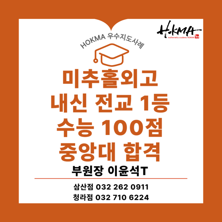 안녕하세요. 삼산동 수학학원, 호크마수학학원입니다. 중학교 시절, 빠른 진도에 지쳐 수학에 흥미를 잃었던 한 학생이 있었습니다. 하지만 호크마와 함께하며 결과는 완전히 달라졌습니다. 미추홀외고 조OO 학생은 수학 내신 1등급을 넘어 3년 내내 전교 1~2등을 유지했고, 수능에서는 수학 100점이라는 결과를 만들어냈습니다. 오늘은 이 변화를 만들어낸 과정을 바탕으로, 삼산동 수학학원 호크마 부원장 이윤석 선생님의 우수지도 사례를 소개해 드리겠습니다. Problem 미추홀외고 조OO 학생은 중학교 1학년 당시, 삼산동 수학학원 호크마를 처음 찾았습니다. 당시 학생은 빠른 선행 위주의 학습에 지쳐 수학에 대한 흥미를 잃은 상태였습니....... <img src="https://blogthumb.pstatic.net/MjAyNjA0MjhfMjI2/MDAxNzc3MzU1NzUyMzQz.IixswGW-FbwQiiaHhFDtpf9y0Or40yJb0BJRbQ6ovQQg.-CYIg0DsOylpRbxBhumi8Xq_WPAT-2FV89nxEF30K5og.PNG/001.png?type=s3" />