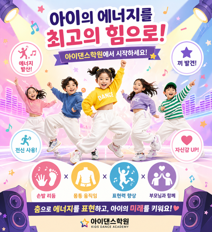 안녕하세요~ 아이댄스학원입니다 아이들은 원래 에너지가 넘칩니다. 가만히 앉아 있기보다 뛰고, 움직이고, 표현할 때 더 밝아지고 더 집중하게 되는 아이들! 우리 아이들 이 에너지를 어떻게 풀어줘야 할지 모르는 경우가 많죠? 그저 “많이 움직이게 해야지”가 아니라 어떻게 움직이느냐가 훨씬 더 중요합니다. 움직임의 질 향상! 아이댄스학원에서는 아이들의 단순한 체력 소모가 아닌, 전신을 사용하는 ‘움직임의 질’을 만들어주는 수업을 진행하고 있습니다. 댄스는 손과 발만 쓰는 운동이 아닙니다. 손으로 리듬을 표현하고, 발로 타이밍을 맞추고, 몸통으로 중심을 잡으며 전체적인 흐름을 만들어가는 활동입니다. 이 과정에서 아이들....... <img src="https://blogthumb.pstatic.net/MjAyNjA0MjhfNjYg/MDAxNzc3MzQ2NzE5MzA0.DhIagzNHfXoeHVXSpmf2r2hR-Or4gB59iGG3DjUvMwAg.XXaklz4Gi4s7YJ0TCwHt_19h3w82dwkn4GI528fhj-og.PNG/ChatGPT_Image_2026%3F%85%84_4%3F%9B%94_28%3F%9D%BC_%3F%98%A4%3F%9B%84_12_25_11.png?type=s3" />