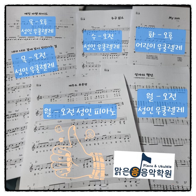 안녕하세요~ 일요일 오후는 꼼짝없이 컴퓨터 앞에 앉아있는 맑은음음악학원 이재샘입니다~ ^^; 오늘 작업의 80%는 학원 게시판에 붙일 학원 소식이었는데요, 캔바를 할 때 뭔가 비효율적 방법으로 시간을 쏟아 붓고 있는 느낌인데, 시간을 내서 어디로 좀 배우러 가야할 것 같습니다... ㅡㅡ;; 우쿨렐레 들고 있는 사람들을 모아서 붙여보았다가... 우쿨렐레 들고 있는 동물들이 나타나서 하나씩 모아봤다가... 비슷한 그림체의 동물들 추려서 줄세워 보고, 동물 바꿔보고... 그런 거 하느라 시간을 다 쓰고 깜깜해져서야 마음이 급해져서 다음주 수업 악보를 준비해봅니다~ 성인 피아노 회원님 한 분과 일주일 동안의 우쿨렐레 수업의 악보를 부....... <img src="https://blogthumb.pstatic.net/MjAyNjA0MjZfNzgg/MDAxNzc3MjExNDcxMTk3.lUwtka_JMz98bWs_94ULoQf2hkOvv6ghhb5a4g_qtMQg.d2KLPjFesjG34E4oaGE7vD_asbcL1ITXFTnokT_T7Bsg.JPEG/KakaoTalk_20260426_224004112.jpg?type=s3" />
