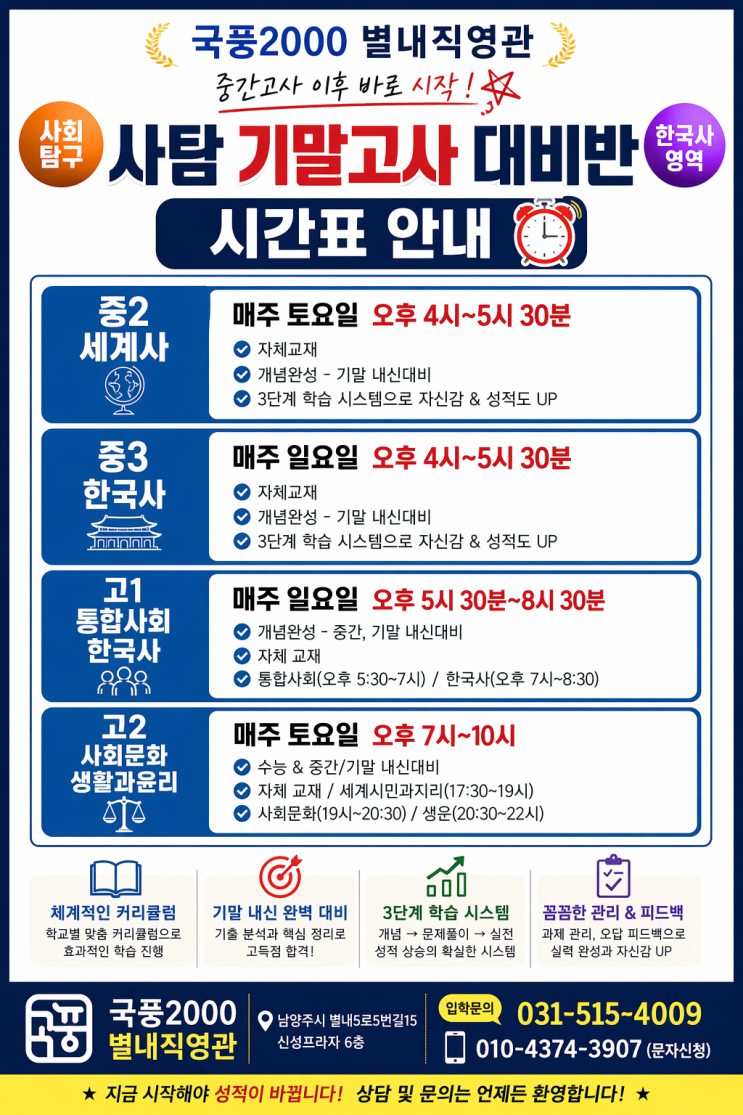 안녕하세요. 국어의 방향을 잡다. 입시의 결과를 바꾸다. 우수한 학생들이 선택하는 학원, 별내 국어·사탐 전문학원 국풍2000 별내직영관입니다. 사탐 기말고사 대비 시간표 안내 1학기 중간고사가 진행 중입니다. 그리고 시험이 끝나면 가장 중요한 시기가 시작됩니다. “다음 전략”을 세우는 시기입니다. 특히 사탐 과목은 준비를 언제 시작하느냐에 따라 성적이 크게 달라지는 과목입니다. 지금부터 준비가 시작되어야 합니다. 수능·내신 대비 사탐 통합 관리 시스템 ✔ 중등부터 고등까지 이어지는 사탐 통합 관리 ✔ 학교별 출판사·시험범위 완벽 분석 ✔ 내신 + 수능 연계 커리큘럼 ✔ 중간고사 이후 약점 보완 집중....... <img src="https://blogthumb.pstatic.net/MjAyNjA0MjRfNiAg/MDAxNzc3MDI0ODA5NDg1.RVl74V5TCzIFM1dsBoBEO4S4Rc6Ttg8E3Rdlh-DNDwwg.zk8nQ24B2sYSQGNW8hvV9XYhHbFu_qKzIuajUXWUNaAg.PNG/%BB%E7%C5%BD%B1%E2%B8%BB%BD%C3%B0%A3%C7%A5%281%29.png?type=s3" />