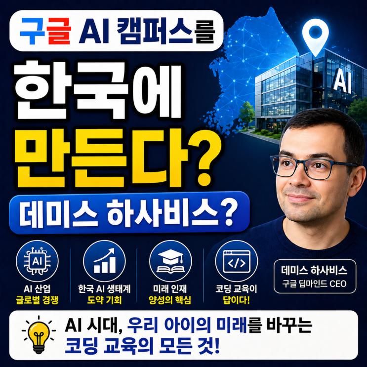 구글 AI 캠퍼스를 한국에 만든다? 데미스 하사비스의 결정이 의미하는 것은 무엇일까요? 최근 AI 산업은 단순한 기술 경쟁을 넘어 국가 경쟁력과 미래 교육 방향까지 바꾸고 있습니다. 특히 구글 딥마인드 CEO인 데미스 하사비스와 같은 글로벌 AI 리더들의 움직임은 전 세계 교육·산업계에서 큰 관심을 받고 있습니다. 만약 구글이 한국에 AI 캠퍼스와 같은 대규모 연구·교육 거점을 확대한다면, 이는 단순한 기업 투자 이상의 의미를 가질 수 있습니다. → 한국이 AI 핵심 인재 육성 국가로 더욱 주목받을 가능성이 있다는 뜻입니다. ▣ 산업 변화: 왜 글로벌 AI 기업들은 한국 시장에 주목할까요? 한국, 기술 중심 국가로 부상 최근 몇 년 사....... <img src="https://blogthumb.pstatic.net/MjAyNjA0MzBfMjc3/MDAxNzc3NTI1NTA3Nzgx.ug_bNNphd6g2bhuazE46jfEUGnqlxJdoWTbXJUum-T0g.MssPIzJ5Vln6-BEtN5-eCCxu1MViWkg7minIr6B2kC0g.PNG/%B1%B8%B1%DBAI%C4%B7%C6%DB%BD%BA_%C7%CF%BB%E7%BA%F1%BD%BA1_%BD%C3%B1%D7%B3%CE.png?type=s3" />