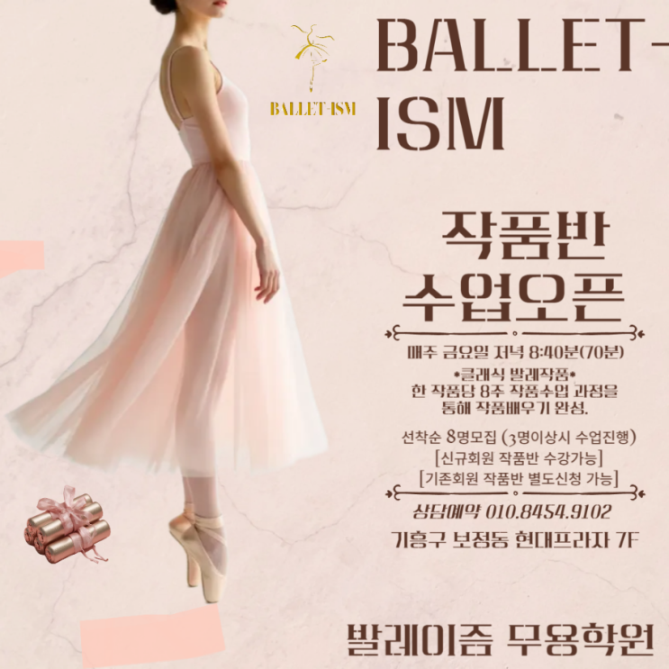 안녕하세요~발레이즘 성인 클래식발레작품반 모집이 곧 마감됩니다!:) 현재 두분 예약이 가능하시니 작품을 희망 하시는 분들은 서둘러 주세요!! ✨ 발레이즘 클래식 작품반 ✨ 5/1일(금) 저녁 8:40분(70분수업) 부터 [코펠리아]_스와닐다 작품 수업이 시작됩니다!~ 우아한 클래식 음악 속에서 한 동작, 한 표현까지 섬세하게 완성해가는 성인 발레 작품 클래스가 오픈되었습니다. 단순한 취미를 넘어, 하나의 ‘작품’을 완성하는 특별한 시간 클래식 발레를 대표하는 아름다운 솔로 작품인 코펠리아에서 아름다운 '스와닐다' 를 직접 배우고, 나만의 감정으로 표현해볼 수 있는 ✨ 단 하나의 특별한 기회 ✨....... <img src="https://blogthumb.pstatic.net/MjAyNjA0MjZfMTk3/MDAxNzc3MTgwNDk0MzQ4.FMsrHKxUoOaxpsxIzAOFr--SLi1Dz5Rm-keaAg9c1Msg.1iBp6WWh1Ga4SCWVCuFNIEKy4L1P0AVJGgNhTM_RtJEg.PNG/IMG%A3%DF0995.PNG?type=s3" />