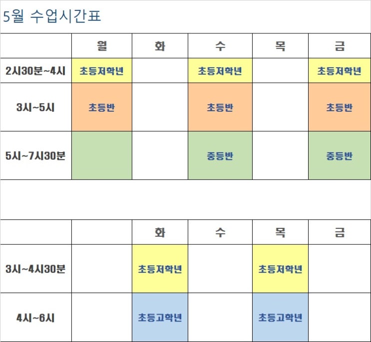 벌써 다음주가 5월달 시작일입니다. 5월달 수업시간표 알려드립니다. 초등저학년(1~3학년)은 주2회 1시간30분씩 수업, 초등고학년(4~6학년)은 주2회 2시간씩 수업, 중등부는 주2회 2시간30분씩 수업합니다. 화,목타임에 1~2자리 여유 있습니다. 월수,수금타임은 상담 후 수업시간 조정하고 있습니다. ** 월,수 time 수업일정 (5월1일 노동절, 5월 25일 부처님 오신날 공휴일로 쉽니다) **화,목 time 수업일정 (5월5일 공휴일로 쉽니다) **수,금 time 수업일정 상담문의 : 010-2398-0880 (문자예약 후 방문상담,전화상담 가능합니다.) 상담가능 시간 : 1~3시 사이 또는 6시 이후 (국민은행 건물 5층입니다) <img src="https://blogthumb.pstatic.net/MjAyNjA0MjRfMTc5/MDAxNzc3MDEwODcyMDA3.w5Ghc7gkQwEdf-CPcgKUl3ksCR8pBGkVVG63mXkZKP0g.Pmj_dXy_c-lKhfS720nOPtSPyTdPz-dCkcImRr8NHlIg.JPEG/5%BF%F9%BD%C3%B0%A3%C7%A5.jpg?type=s3" />
