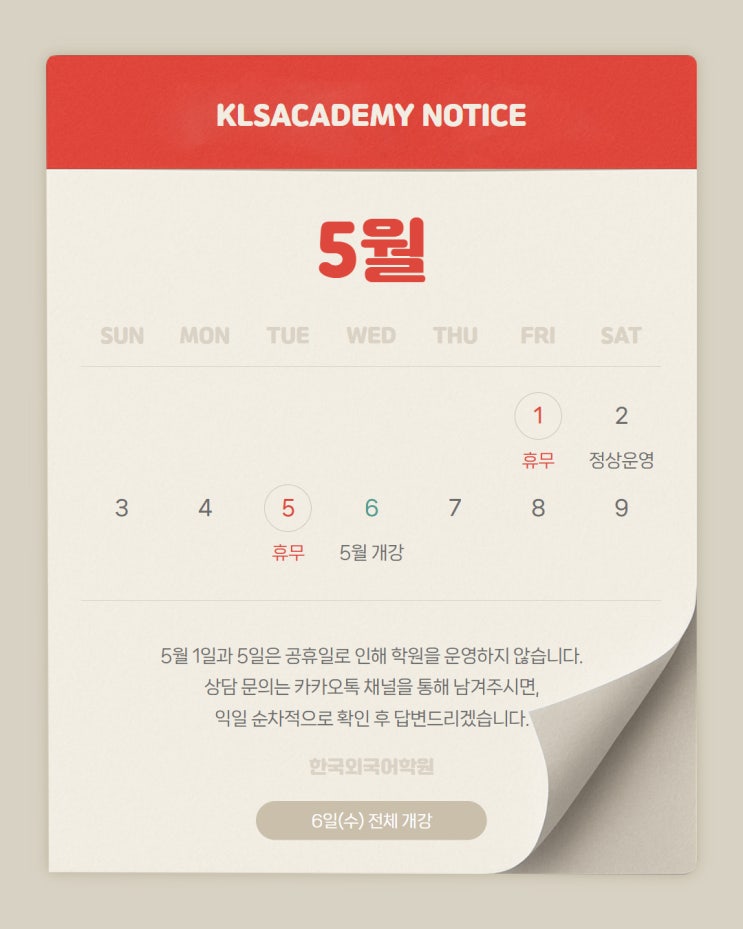 한국외국어학원 5월 운영 일정 및 개강 안내