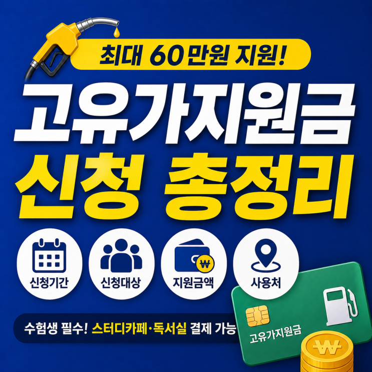 요즘 고유가와 고물가라는 단어가 하루도 빠짐없이 등장하며 우리의 마음을 무겁게 합니다. 이럴 때 들려온 정부의 고유가지원금 신청 소식은 불경기에 단비 같은 반가운 소식입니다. 하지만 내가 지원금 대상에 포함되는지, 정확한 사용처는 어디인지 막막해하시는 분들이 많습니다. 복잡한 정보들 때문에 바쁘게 공부하는 수험생들은 중요한 지원금 신청 기간을 무심코 놓쳐버리도 합니다. 그래서 한 시가 아쉬운 여려분의 귀한 시간을 아껴드리기 위해 헷갈리는 정보들을 깔끔하게 정리해 보았습니다. 신청 대상 및 지원금액 알아보기 이번 지원 대상은 중위소득 150%이하 이며, 거주 지역과 소득 구간에 따라 지원 금액이 차등 지급됩니다. 신....... <img src="https://blogthumb.pstatic.net/MjAyNjA0MjlfMTk0/MDAxNzc3NDYxNzYwOTI3.3DpStzTd6K1fIIpOR_aBqUFRqnS7IwjbCfrErF2ePlYg.mducHTmYXxt2KYfvYzK-vrUQXtE4P9b1_UPFfkv9IBwg.PNG/%B0%ED%C0%AF%B0%A1%C1%F6%BF%F8%B1%DD_%BD%BA%C5%CD%B5%F0%C4%AB%C6%E4.png?type=s3" />