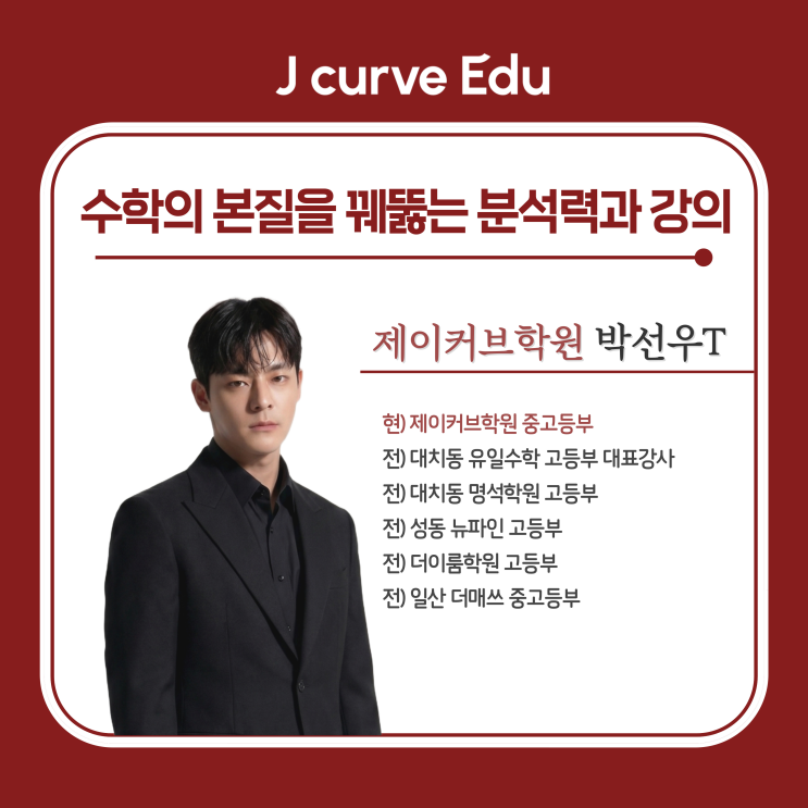 안녕하세요 서대문구 종로구 중고등학교 입시 내신 수학전문 제이커브학원입니다. 오늘은 제이커브학원 중고등부에 새롭게 합류하신 박선우 선생님을 소개드리고자 합니다. 박선우 선생님은 대치동에서 수년간 고등부 전임강사로 활동해온 경력을 바탕으로, 이번에 제이커브학원과 함께하게 되었습니다. 어떤 교육관을 가지고 계신 강사님인지, 어떤 수업 스타일로 강의를 진행하실지 자세히 소개해드리겠습니다. 강사 경력 및 주요 성과 박선우 선생님은 대치동에서 고등부 수학을 전담하며 휘문고·단대부고·진선여고 등 시험 난이도가 높기로 알려진 학교 학생들을 지도해왔습니다. 까다로운 시험 구조 속에서도 학생들을 1등급으로 이끄는 기....... <img src="https://blogthumb.pstatic.net/MjAyNjA0MjlfMjk5/MDAxNzc3NDYyNDkzODE0.h5vGkUIC0cbz4ykuyJNSGuz7Z0TTRaASqGUPpYhuRIsg.rMG0fENpz40075h79ATErd7_XLTdEFe-qpdsi7FtnPAg.PNG/image.png?type=s3" />