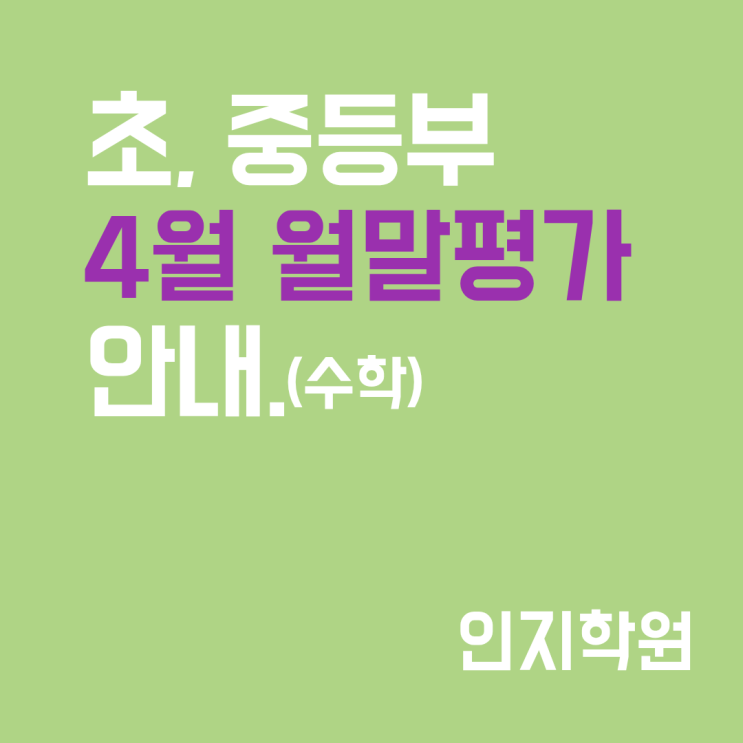 벚꽃이 피던 계절을 지나 어느덧 1학기의 중간 지점에 와 있습니다. 학생들이 그동안 열심히 공부한 것들이 어떤 결실을 맺고 있는지 그리고 앞으로 어떻게 공부해야 할지 확인하기 위해 4월 월말평가를 실시합니다. 중등부 2학년부터는 학교 시험으로 대체합니다. ※ 4월 월말평가 시험 안내 ※ 대상 : 초등부, 중등부 1학년 일시 : 4월 30일(목) 범위 : 각 학년 1학기 3,4단원 #인지학원 #북가좌동 #남가좌동 #초등수학 #중등수학 #고등수학 #북가좌초 #가재울초 #연가초 #가재울중 #연희중 #명지중 #이대부중 #가재울고 #명지고 #한성고 #충암고 #수학학원 #영어학원 <img src="https://blogthumb.pstatic.net/MjAyNjA0MjlfMjky/MDAxNzc3NDQwNjA5MjU1.YOSexWcMdirr5Un6uXstw00i4gZWQbsUk6XebSpLVm8g.3w0R8_GQKM5m4js0BVzMnxF_TM_ra7QWV0MyjQM12Tsg.PNG/%C1%A6%B8%F1%C0%BB_%C0%D4%B7%C2%C7%D8%C1%D6%BC%BC%BF%E4.-_%BA%B9%BB%E7%BA%BB.png?type=s3" />