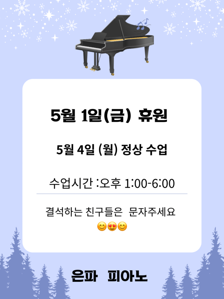 5월 수업일정 안내드립니다 ⠀ 5/1(근로자의 날), 5/5(어린이날)은 휴원이며, 5/4(월)은 정상수업입니다. ⠀ 일정 참고하시어 수업에 착오 없으시길 바랍니다 :) 음사랑음악학원 ✅ 교육과목 : 피아노, 드럼 ✅ 교육대상 : 유아반, 유.초.중.고등부 ⠀ 교육상담문의 ✅️ 본원 : 061.791.1611 광양시 사동로 186 3층 / 광양 마동초등학교 부근 ✅️ 2호점 : 061.791.3008 광양시 오류로 53 2층 / 광양 중앙초등학교 부근 ⠀ #광양피아노학원 #중마동피아노학원 #광양드럼학원 #중마동드럼학원 #광양음악학원 <img src="https://blogthumb.pstatic.net/MjAyNjA0MjNfMTQ2/MDAxNzc2OTM5ODYwMDQx.SWIp6IdTYEzxqIqEmgl1WSbvF9X_w7XVG9_dZaChi9sg.UKgZ4v0O7Blyt-A2z9Uk83TjvSRYhHznMCbVr3c24t0g.JPEG/%C7%CF%B4%C3%BB%F6_%B1%F2%B2%FB%C7%D1_%C8%DE%B9%AB_%C8%DE%C0%CF_%B0%F8%C1%F6_%BE%C8%B3%BB_%C0%CE%BD%BA%C5%B8%B1%D7%B7%A5_%B0%D4%BD%C3%B9%B0.jpg?type=s3" />