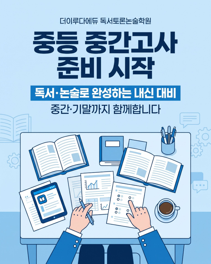 안녕하세요? 더이루다에듀 독서토론논술 학원 입니다 요즘 중등부 친구들은 차근차근 시험 대비를 진행하고 있는데요 많은 학생들이 시험 준비를 ‘문제풀이’ 중심으로만 생각합니다. 하지만 실제 시험에서 점수를 가르는 것은 지문을 이해하는 힘 핵심을 정리하는 힘 서술형으로 표현하는 힘 입니다. 독서가 곧 시험 대비입니다 국어 시험은 물론, 사회·과학까지 모든 과목은 ‘읽기’에서 시작됩니다. 지문을 제대로 이해하지 못하면 문제를 풀어도 정답률이 흔들릴 수밖에 없습니다. 그래서 더이루다에듀는 ✔ 지문 분석 ✔ 핵심 내용 파악 ✔ 구조 이해 를 중심으로 독해력부터 탄탄하게 잡아갑니다. ✍....... <img src="https://blogthumb.pstatic.net/MjAyNjA0MzBfMjQx/MDAxNzc3NDg5ODQ3Mjky.k__RwcLkMPx0yT4OD1UfjXLqqF5_zuKOaRsBH5Z57cwg.wb2kZ3O4LMnsKz-kTQESAL-d8cmMyB8fqik39UHAB6Eg.PNG/%C5%A5%B9%CC%B8%A3_%C3%A2%BE%F7%C3%DF%C3%B5_%2831%29.png?type=s3" />