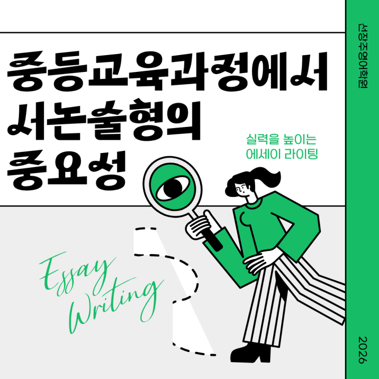 안녕하세요 선장주영어학원입니다. [ 중등 영어에서 가장 중요한 것, ‘서논술형’ ] 최근 영어 내신의 흐름은 분명하게 바뀌고 있습니다. 단순한 객관식 문제 풀이 중심에서 벗어나 직접 쓰는 능력, 즉 ‘서논술형’이 핵심 평가 요소로 자리 잡고 있습니다. 특히 2022 개정 교육과정에서는 영어를 ‘이해하는 것’에서 끝나는 것이 아니라 자신의 생각을 영어로 표현하는 능력을 더욱 중요하게 평가합니다. < 중등 과정은 “고등을 준비하는 시기” > 많은 학부모님들이 “고등학교 가서 글쓰기 준비하면 되지 않을까요?” 라고 생각하시지만, 실제로는 그렇지 않습니다. 고등학교 내신은 이미 서술형, 논리적 글쓰기 능력이 갖춰져 있다....... <img src="https://blogthumb.pstatic.net/MjAyNjA0MjdfMTg2/MDAxNzc3MjkyMzA5MjY1.yL9_Y9-8IBJFHJ1QzGAEIiGRYNASo8MqgTGL5eI0OO0g.eByeH49ezPY3YjzJ61MfNjfq8Hk184HgxhZb7km-3Log.PNG/1.png?type=s3" />
