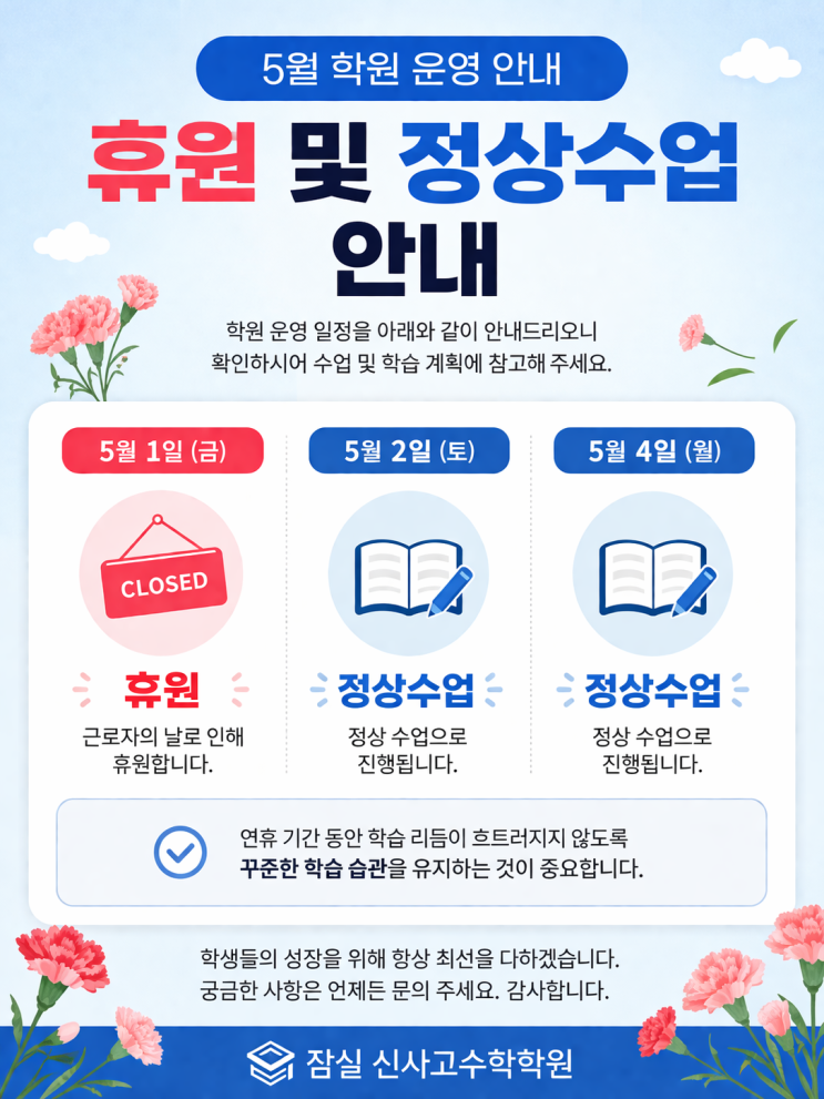 안녕하세요. 잠실 신사고수학학원입니다. 5월 학원 운영 일정 안내드립니다. 5월 1일(금) 근로자의 날은 휴원입니다. 해당일에는 모든 수업이 진행되지 않으니 등원에 착오 없으시길 바랍니다. 반면, 5월 2일(토), 5월 4일(월)은 정상 수업으로 진행됩니다. 연휴 기간 동안 학습 리듬이 흐트러지지 않도록 정해진 시간에 맞춰 꾸준히 공부하는 것이 중요합니다. 특히 시험을 앞두고 있는 학생들은 이 시기를 잘 활용해야 합니다. 학원에서도 학생들이 흔들리지 않고 안정적으로 공부할 수 있도록 꼼꼼히 지도하겠습니다. 일정 확인 부탁드리며, 궁금한 사항은 언제든 문의 주세요. 감사합니다. 잠실 신사고수학학원 <img src="https://blogthumb.pstatic.net/MjAyNjA0MjhfODEg/MDAxNzc3MzYwMzk0NjY1.RM-S8i08cuvXvvh2fo73flc1pUz_8_Yi9z7K9crETvog.n0FyJNtuPZVjaAOtB3Ll516bnxj2zcf6LtaWdX9dRbYg.PNG/24d2d1c9-e3e2-4162-979f-1926cce74ea1.png?type=s3" />