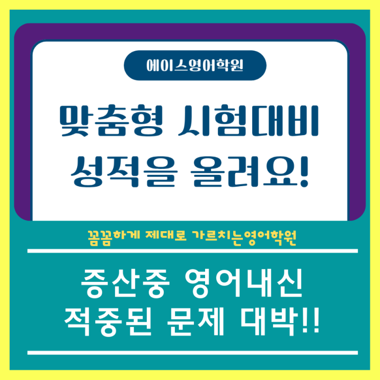안녕하세요 양산 증산 영어학원 에이스영어학원입니다! 저희 영어학원에서 증산중에 다니고 있는 학생들의 시험이 끝나고 영어시험지를 봤는데 이번에도 역시 작년 1학년 2학기와 마찬가지로 영어내신시험이 100% 서술형으로 출제가 되었습니다!! 서술형 100%는 무조건 영어문법과 작문이 결정합니다! 이제는 무조건 영어작문에 대한 준비를 해야 합니다! 이번에 증산중 영어내신의 경우에 총 13문제가 출제되었고 한문제당 여러문제가 있는 것을 감안해도 문제수로는 20개정도가 됩니다! 한 문제당 8점~12점까지 분포되어서 한문제당 비중이 큽니다! 점수이 격차가 클게 날 수 있습니다! 단 두문제만 완전히 날리면 거의 20점이 날라갑니다! 이....... <img src="https://blogthumb.pstatic.net/MjAyNjA0MjVfNjcg/MDAxNzc3MDkwOTExMzM3.fG5DXoJsbb6oG-9VYgj74erh2L5Nes0iLjYogldl6Zwg.Jm0N40DGlm4u5_KB26HvneDVWlp6rZ6_fBHaKOPshQgg.PNG/%BF%A1%C0%CC%BD%BA%BF%B5%BE%EE%B9%E9%C6%DB%BC%F6%C7%D0%C0%D4%BD%C3_%285%29.png?type=s3" />