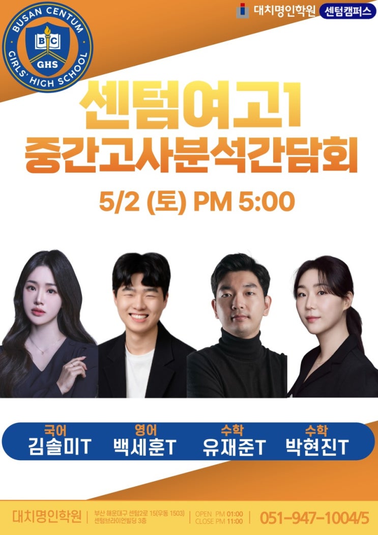 센텀여고1 중간고사 분석 간담회 일시 : 5/2 (토) PM 5:00~ 안녕하세요, 학부모님. 센텀여고의 첫 고교 내신 시험을 앞두고 있습니다. 이번 시험은 중등 과정과는 확연히 다른 난이도와 유형으로 우리 학생들에게 큰 도전일 것입니다 중간고사를 마치고,, 단순히 점수를 확인하는 것을 넘어, '왜 이런 결과가 나왔는지'와 '기말고사는 어떻게 달라져야 하는지'에 대한 명확한 해답을 드리고자 분석 간담회를 개최합니다. ◈내용 -이번 중간고사 과목별 출제 경향 및 킬러 문항 완벽 분석 -센텀여고 등급대별 강점과 약점 파악 -역전을 위한 기말고사 대비 전략 및 관리 로드맵 √ 센텀여고 내신의 정답을 보여드리겠습니....... <img src="https://blogthumb.pstatic.net/MjAyNjA0MjVfMTkz/MDAxNzc3MDgzMTU1ODI2.uh3Mh6H4k-ekhX2sFYTBEMDYbVOm-FwFIRLpcygs_gUg.3f5VrdiwxLGz7a5Z29wViVG6pkaRZ7GB5k0RJr9trFAg.JPEG/3_182Ud018svc1qnlpr5vs9g50_fr3cpk_%281%29.jpg?type=s3" />