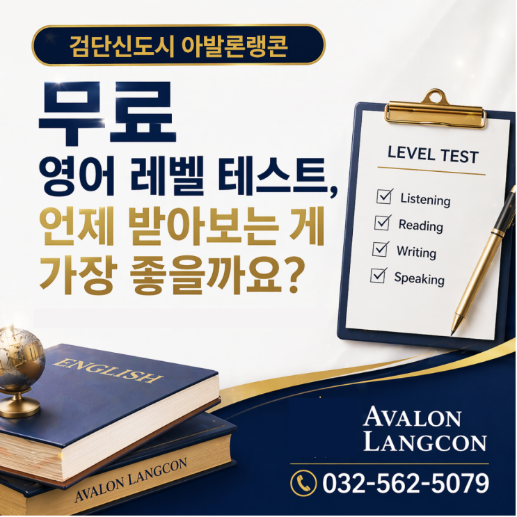 인천 검단신도시 영어교육의 중심 아발론랭콘 아라캠퍼스입니다. 1. 영어 학원에 적응이 힘들었던 2. 사랑이 많은 선생님이 필요한 3. 애정표현이 많은 선생님이 좋은 4. 학습 태도의 개선의 필요한 5. 공부 의지와 동기가 약한 학생들에게 최. 적. 화. 된 학원 아발론 랭콘 아라캠퍼스입니다 오늘 많은 학부모님께서 궁금해 하실 '영어 레벨테스트를 언제 받아보는게 가장 좋을지 ' 에 대한 포스팅을 가져왔습니다 영어학원을 다니고 있든 이제 막 시작을 고민하고 있든 부모님들의 공통으로 궁금해하시는 질문이 있습니다. "지금 레벨테스트를 받아보는게 맞을까?" "조금 더 지켜봐도....... <img src="https://blogthumb.pstatic.net/MjAyNjA0MjNfNDYg/MDAxNzc2OTI0NzE2Njgy.fP3OpylLF1WAMfFEZJ_2thpfzZ2FZ5eUWKfi8R3hm0og.KaPtkHO7mQXePar-9SevXBir_So74tqHA3iVbWtu0rMg.PNG/2.png?type=s3" />