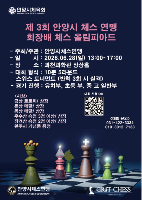 안녕하세요, 우리 아이들의 논리력과 집중력을 키워주는 청라체스, 체스런입니다. 다가오는 6월, 우리아이의 첫 어린이 체스대회 참가를 고민하고 계신 학부모님들을 위해 반가운 소식을 가져왔습니다. 바로 유치부와 초등학생 친구들이 참가하기 좋은 초등학생 체스대회, '제3회 안양시 체스연맹 회장배 체스 올림피아드' 개회 소식입니다. 이번 어린이체스대회는 아이들이 좋아하는 국립과천과학관에서 열립니다. 주말을 맞아 초등학생 체스대회에서 두뇌 싸움도 펼치고, 대회가 끝난 후에는 과학관 관람까지 할수 있어 1석 2조의 알찬 주말 일정을 계획하시기에 좋습니다. 2026년 6월 어린이 체스대회 핵심 요약 대회명 : 제3회 안....... <img src="https://blogthumb.pstatic.net/MjAyNjA0MjhfODQg/MDAxNzc3MzQwMTgwNjg2.-XelC8Y6RkUfn2i9iTsWsniCUezfs_zKHhH6DsWhb1gg.p0IAGQi_UBXUz2QfPULGzx0MbtMsCJU-I90YHwKD6Bcg.PNG/20260628_%BE%C8%BE%E7%BD%C3%C3%BC%BD%BA%B4%EB%C8%B8.PNG?type=s3" />