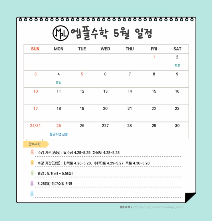 리드101 광교점 2026년 5월 예약 및 휴원/단축수업 안내