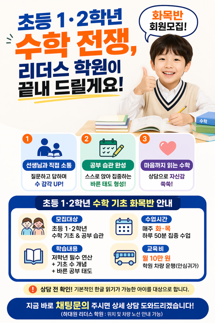 [화목반] 초등 1·2학년 수학 10만원 리더스 학원