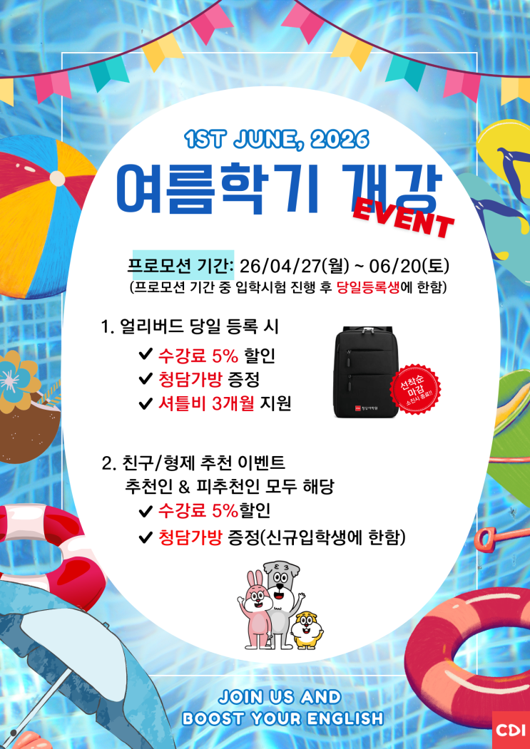 26' 여름학기 개강 안내 우리 아이 영어 실력, 이번 여름이 기회입니다! 안녕하세요. 청담어학원입니다. 다가오는 여름 학기, 아이의 영어 실력을 한 단계 성장시킬 수 있는 2026 여름학기 개강 소식을 안내드립니다. 어떤 환경에서 어떻게 보내느냐에 따라 아이의 학습 습관과 자신감은 크게 달라질 수 있습니다. 학기 및 등록 안내 개강일: 2026년 6월 1일 프로모션 기간: 2026년 4월 27일(월) ~ 6월 20일(토) 기간 내 입학시험 후 당일 등록 시 혜택 적용 학부모님을 위한 등록 혜택 ✔ 수강료 5% 할인 ✔ 청담어학원 전용 가방 증정 ✔ 셔틀비 3개월 지원(72,000원 상당) 초기 등록 부담을 덜어드릴 수 있....... <img src="https://blogthumb.pstatic.net/MjAyNjA0MjRfMTQ2/MDAxNzc3MDI5NTg5MTA4.sEpe-I7Sayl2lK8biUHn6jcbwlUCCjcFpr0MVN7T6Xcg.R0ZX5dUhqB__kWjqIc0xqYox83i4hQy54MsPgYu10iEg.PNG/KakaoTalk_20260424_200309383.png?type=s3" />
