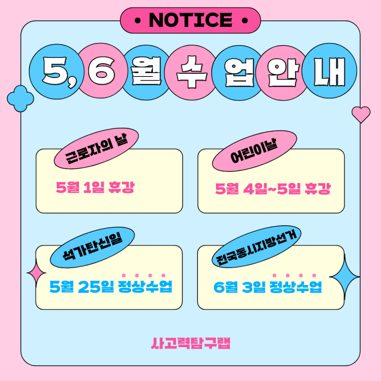 안녕하세요. 김해 율하 사고력탐구랩입니다. 5월~6월 수업 안내 드립니다. ●5월 1일 금요일 : 휴강 ●5월 4일 월요일~ 5일 화요일 : 휴강 ●5월 25일 월요일 부처님오신날 대체공휴일 : 정상 수업 ●6월 3일 수요일 지방선거 : 정상 수업 수업 일정 미리 확인 부탁드립니다. 탐구하는 힘이 자라는 곳, 사고력탐구랩에서 함께 해요~. (수업 중에는 통화가 어려우니 메시지 남겨 주세요~.) #김해율하사고력수학 #김해율하매쓰몽플러스 #김해율하관동초수학 #김해율하유치부수학 <img src="https://blogthumb.pstatic.net/MjAyNjA0MjhfMjQ5/MDAxNzc3MzU3NTU1NTA2.afIwwlCM6ppI9GAhnMv1WSkTZ9gDn0pIAYT-W8k6BLwg.9qxhgkvewwXpgIeJ0D-6UBBWndF_tH0mTAun5ZzpP_gg.PNG/5%BF%F9_%BC%F6%BE%F7_%BE%C8%B3%BB_%281%29.png?type=s3" />