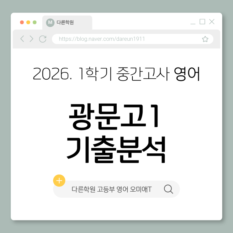 강동구에서만 20년 전통의 영어학원, 다른학원! 2026년에도 신뢰할 수 있는 수업으로 다른이들의 미래를 위해 최선을 다하겠습니다. 2026년 광문고 영어 최상위권을 원한다면 다른학원 미애T 안녕하세요! 다른학원 광문고 영어 담당 오미애T 입니다 오늘은 광문고 1학년 중간고사 영어 시험 분석자료를 들고 왔습니다! 고등학교 첫 영어시험이었는데 시험 범위도 많고, 문항수도 역대급으로 많아서 많은 부담감을 가지고 시험을 봤을것으로 예상합니다 그래도 문제 난이도는 많이 어렵지 않아서 시간관리만 잘 했다면 고득점을 기대해봐도 좋을 것 같습니다! 끝까지 포기하지 않고 열심히 잘 따라와줘서 우리 광문 친구들 정말정말 고맙....... <img src="https://blogthumb.pstatic.net/MjAyNjA0MjZfMyAg/MDAxNzc3MTk3MzI5MTg4.o0fDkU2v07rOwKJtdTFAUBMYQEyzOH_QRpGF6v_rxBMg.nfyRmOJhkLTVxVxCSD7YP_6Zb56wcpiu3wgI-0uTquIg.PNG/1.png?type=s3" />