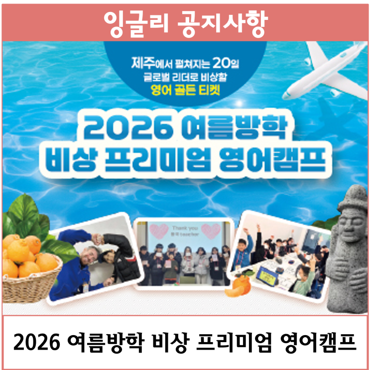 안녕하세요. 잉글리시아이입니다:) 2026 여름방학을 영어 실력 향상과 한 단계 더욱 성장하는 시간으로 채우고 특별한 추억까지 쌓을 수 있는 '2026 여름방학 비상 프리미엄 영어캠프'!! 국내 최적의 영어 환경 제주에서 원어민과 영어 학습을 넘어 다채로운 활동을 경험하며 오감을 깨우는 영어는 잊히지 않는 생생한 실력이 되고, 영어 자신감으로 이어질 것입니다. '2026 여름방학 비상 프리미엄 영어캠프' 소식에 잉글리시아이 학부모님들과 회원들은 큰 관심을 보여주고 계시는데요. 일정 및 프로그램을 자세히 알아볼 수 있는 학부모 온라인 캠프 박람회가 진행됩니다. 잉글리시아이 학부모님들의 많은 참여와 관심을....... <img src="https://blogthumb.pstatic.net/MjAyNjA0MjhfMTI4/MDAxNzc3MzU3MDE5Mzgx.dp3LsX5WKZIOJKBCvwvRF_qeDgNILToKo_rIZfK86Xcg.QMNojKLwBez42U_Z4J8tNbC_wQ30p87Vtgz1hIt2Uygg.PNG/%B1%D7%B8%B21.png?type=s3" />