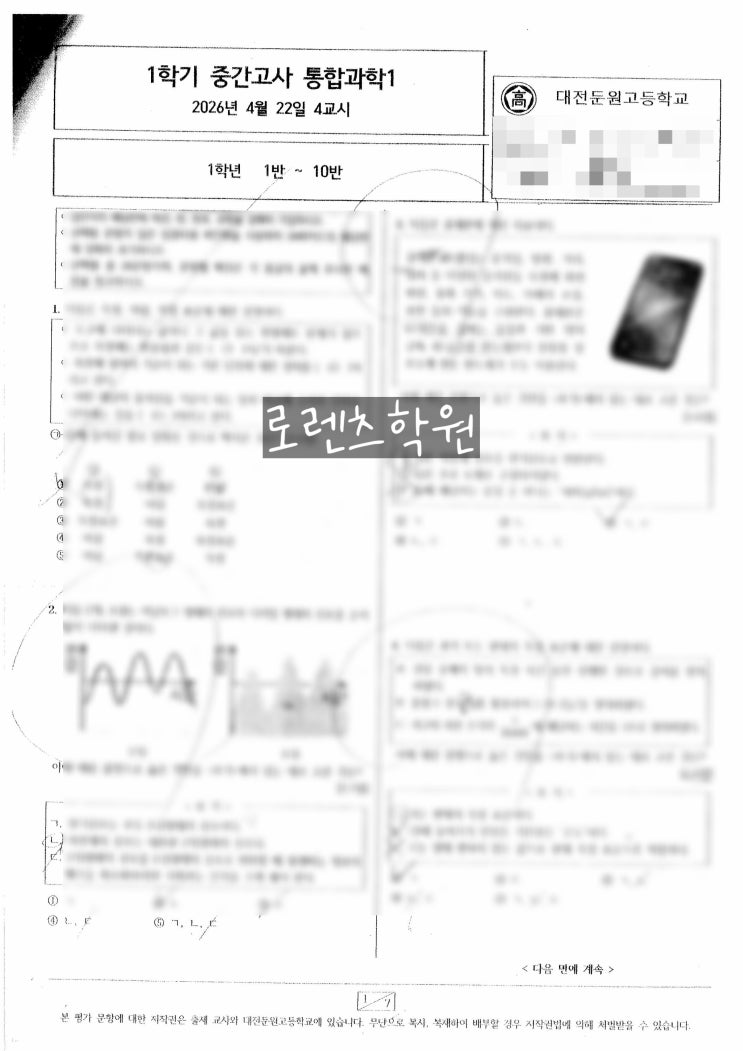 안녕하세요 대전 둔산동 수학 과학 전문 로렌츠학원입니다. 2026학년도 첫 중간고사를 치르고 있습니다. 벌써 친 학교도 있고 아직 치르고 있는 학교도 있습니다. 이번 둔원고 1학년 통합과학1 시험을 치르고 난 뒤 생각보다 까다로운 문제들에 당황한 학생들이 많았을 텐데요. 고등학교 입학 후 첫 시험 예상보다 낮게 나온 점수에 학원 이동을 고민하고 계신다면 오늘 로렌츠학원의 둔원고 기출문제 분석과 확실한 과학 성적 향상 비법을 확인해 보시기 바랍니다. 둔원고 1학년 1학기 중간고사 통합과학 출제 경향 분석 서답형 없는 28문항, 방심할 수 없는 함정들 이번 둔원고 통합과학1 시험은 서답형 없이 선택형 객관식으로만 28문항이 출....... <img src="https://blogthumb.pstatic.net/MjAyNjA0MjZfMTA2/MDAxNzc3MTc2Njk2MzY1.2ZgAbtJp10DSZwRbDYm4CAoZzoloEqz0oo6KqPpRM6og.XoFkp5YsqDH49SR02p-qrHjj_DomsPRCxHJncxS5kBAg.JPEG/%B5%D0%BF%F8%B0%ED%C5%EB%C7%D5%B0%FA%C7%D01-%C0%CC%B9%CC%C1%F6-1.jpg?type=s3" />
