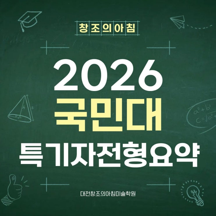 안녕하세요 미대입시의 기준을 만들어가는 대전 창조의아침 미술학원입니다 국민대학교 조형대학은 미대 입시를 준비하는 학생들에게 꾸준히 높은 선호도를 보이는 대학입니다. 오늘은 실기 실력이 검증된 학생들에게 가장 유리한 전형인 2026학년도 국민대학교 미술·조형 특기자 전형을 핵심만 정확하게 정리해드립니다. 특히 실기대회 입상 실적을 어떻게 합격으로 연결할 수 있는지까지 실전 전략 중심으로 안내드립니다! 국민대학교 특기자 전형은 일반적인 수시 전형과 달리 실기대회 입상 실적을 중심으로 선발하는 전형입니다. 입상 실적 + 면접 + 학생부 교과를 종합 평가하며, 다른 대학과 달리 독특한 기준이 존재하기 때문에 정확한 이....... <img src="https://blogthumb.pstatic.net/MjAyNjA0MjNfMjQ1/MDAxNzc2OTQwNDgzNTQ2.bmiwxFVCoMrzHFN1AI1ozD41d94Vu2hnBscUeZzy1fgg.QwFwubTe-s_S-yzyhD8S1YeADiz1aASx_3GdV3Jb8Kgg.JPEG/205.jpg?type=s3" />