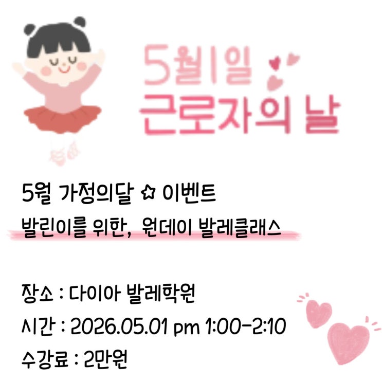 안녕하세요 ~ 다이아 발레학원입니다. 가정의달 5월 이벤트로 원데이 발레 클래스를 준비하고 있습니다. 2026년 5월 1일 pm 1:00-2:10 기초반으로 원장T 수업으로 "매트 / 두손바 / 센터 배워보기 " 로 진행 예정힙니다. 수강료는 비회원 20,000 / 5월 수강등록 회원 15,000원 입니다. ( 중고등학생 + 성인 신청 가능합니다.) 신청방법은 " 5/1 원데이 신청 + 이름 " 문자 보내주시면 계좌번호 안내드립니다. (입금 신청순으로 등록 마감합니다.) 010.3005.8768 번호로 4월 29일 오후 4시까지만 신청 받겠습니다. <img src="https://blogthumb.pstatic.net/MjAyNjA0MjVfMTk1/MDAxNzc3MTA2OTYzOTY1.eaZdb0c_V5we9e8tJyDX3aifsepL184ne_znY9MRm_og.VDex6X4FBQHG0cwtr5tjpN12M73joGr_Z2vdgdBc25Qg.JPEG/001.jpg?type=s3" />