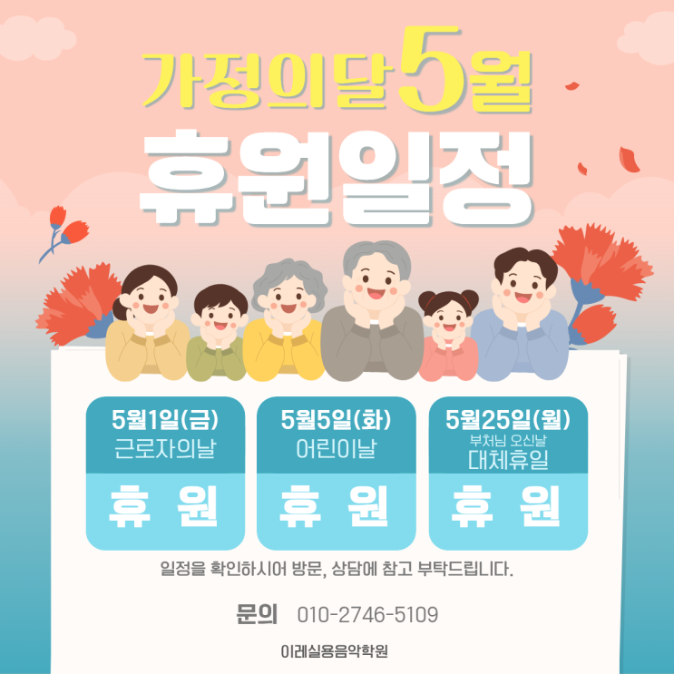 안녕하세요, 이레실용음악학원입니다. 어느덧 푸르른 5월이 다가오고 있습니다. 가족과 함께 따뜻한 시간 보내시길 바라며, 5월 휴무 일정을 안내드립니다. ✅5월 1일 (금) 근로자의 날: 휴무 ✅5월 5일 (화) 어린이날: 휴무 ✅5월 25일 (월) 부처님 오신 날: 휴무 (✅ 위 일정을 제외한 평일 수업은 정상적으로 진행됩니다.) 휴무 기간 중에는 학원 시설 이용 및 상담이 어려우니 양해 부탁드립니다. 수업 관련 문의 사항은 메시지 남겨주시면 운영 시간에 순차적으로 답변드리겠습니다. 감사합니다. <img src="https://blogthumb.pstatic.net/MjAyNjA0MjdfODYg/MDAxNzc3MjY4MzYxMjMx.ccCDnymXmvXT2dpsSmpDOvWejQc_w7CCbWt9b-Cp5vsg.wT6nwS3GFRCbCjYUCBjZkIFoxHgG-FX7m7fUwYytuy4g.PNG/5%BF%F9%C8%DE%B9%AB%BE%C8%B3%BB.png?type=s3" />