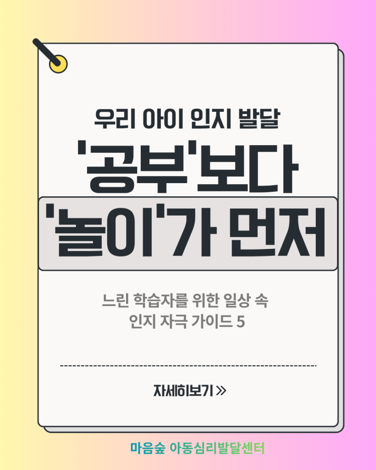안녕하세요, 아이의 속도에 맞춰 한 걸음씩 나란히 걷는 365다움의원파주운정 병원부설 마음숲 아동심리발달센터입니다. 아직 학교에 가기 전인 유아기 아이들에게는 '공부'라는 틀보다는 놀이와 일상 속에서 자연스럽게 인지 능력을 길러주는 것이 핵심입니다. 1. '한 번에 하나씩' 단계별 지시법 (Step-by-Step) 느린 학습자 아이들은 정보 처리 속도가 조금 천천히 흐릅니다. 여러 가지 명령을 한꺼번에 받으면 뇌에서 과부하가 걸려 멍해질 수 있어요. Bad: "가서 손 씻고, 수건으로 닦은 다음에 식탁에 앉아." Good: "먼저 화장실 가서 손 씻고 올까?" (수행 확인 후) "이제 수건으로 톡톡 닦....... <img src="https://blogthumb.pstatic.net/MjAyNjA0MTZfMTM2/MDAxNzc2MzA0MzAwMjcz.GWYW0ZWJDX5QDof2xdsrm4FeGzASiPhUqcxwTwNg-zAg.0TAUi_iVtb0BsTgCuxGLdmna7kt0PZ_MyXLPhgW50NQg.PNG/1.png?type=s3" />