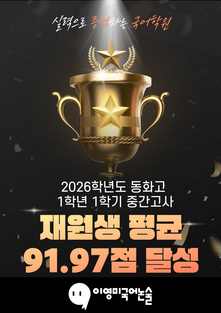 2026년 동화고 1학년 1학기 중간고사 결과 재원생 평균 91.97점 90점 이상 54명 동화고1 국어 중간고사 100점 14명 · 평균 91.97점 ·상위 63% 안녕하세요. 이영미국어논술학원입니다. 동화고 1학년 학생들이 고등학교 입학 후 첫 국어 내신 시험을 치렀습니다. 낯선 내신 환경 속에서도 끝까지 집중하며 준비해준 학생들에게 먼저 수고했다는 말을 전합니다. ■ 결과는 숫자로 증명됩니다 이번 시험에서 재원생들은 객관식 기준 평균 91.97점이라는 결과를 만들어냈습니다. 단순히 일부 학생의 고득점이 아니라, 전체적으로 안정적인 학습이 이루어졌다는 점이 핵심입니다. 또한 90점 이상 54명이 배출되었습니다. 상위권 일부가 아니라 중위권까....... <img src="https://blogthumb.pstatic.net/MjAyNjA0MjhfMTA3/MDAxNzc3MzY5MTc3MDc2.f0Tj3wEcqukrNbWcRmF8_2qm2CkjVXXJUU8lha8qvmYg.hXybOb1zCVRl-PQH68FR3Gb2E655V1IFARauZTQ9hoMg.JPEG/91.9%B4%DE%BC%BA.jpg?type=s3" />