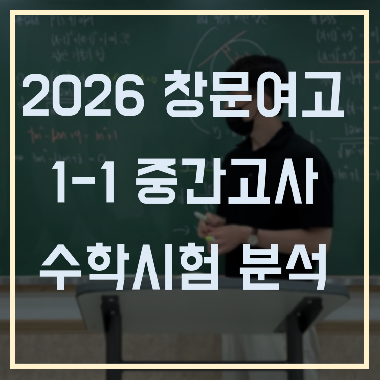 안녕하세요~ 창문여자고등학교 수학 전문 디오수학학원입니다. 이번 포스팅에서는 4/24(금)에 시행된 2026 창문여고 1-1 중간고사 수학 시험 분석을 해보겠습니다. 2026 창문여고 1-1 중간고사 범위는 공수1 다항식 ~ 이차함수이며, 선택형 18문항 70점, 단답형 6문항 30점 배점으로 시험이 구성되었습니다. 2022 개정 교육과정이 적용되면서 인근 타 학교와 달리 창문여고는 시험 출제 기조에 큰 변화가 없었는데요. 이번 2026 창문여고 1-1 중간고사 수학도 이전과 같은 기조로 출제되었습니다. 교과서 수준의 기초문항을 50% 배치하고 모의고사 기출문항이 상당 수 출제되었습니다. 전반적인 난이도는 평소와 비슷한 가운데 변별력 문항이 이....... <img src="https://blogthumb.pstatic.net/MjAyNjA0MjRfODcg/MDAxNzc3MDA5MDU3MDk5.tdh0-hKYXCzx-U0zNOg5AILJgJ4ZR3ZF7Ig48_LGKscg.32bCdvMT2v7wPVCAYqxyZ9iLhrehwjTUr4Qjv05Is38g.PNG/%B1%D7%B8%B21.png?type=s3" />