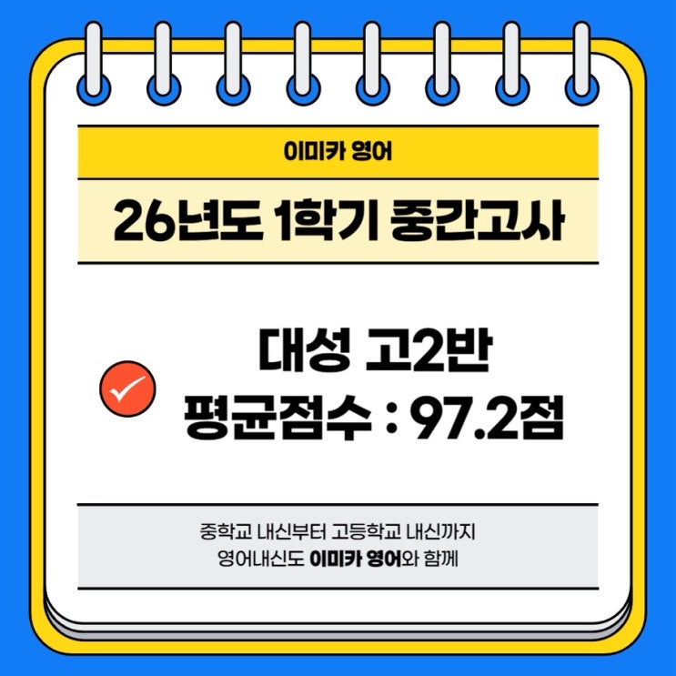 2026년 고등학교 1학기 중간고사 성적 공개합니다! 열심히 준비한 만큼 좋은 결과가 따라옵니다 우리 학원생들이 정말 좋은 결과를 보여주었어요. ✅ 대성 고2반 1학기 중간고사 평균 97.2점 ▲ 이미카 영어 고등부 모집 안내 ▲ 이미카 영어 중등부 모집 안내 상담 안내 상담 문의 02 - 6053 - 0505 010 - 8674 - 0501 상담 가능 시간 AM10:00 - PM06:00 <img src="https://blogthumb.pstatic.net/MjAyNjA0MjlfMTYg/MDAxNzc3NDUzODIwNzgw.JyOgBSbvk63onCLN_R3kvZJnze9Ry7W6NIDhgNLspGEg.jBVLNK9_2B15u7aIZB7MUoh6IyOYkoFKr8VjnvMEuacg.JPEG/IMG%A3%DF6279.JPG?type=s3" />