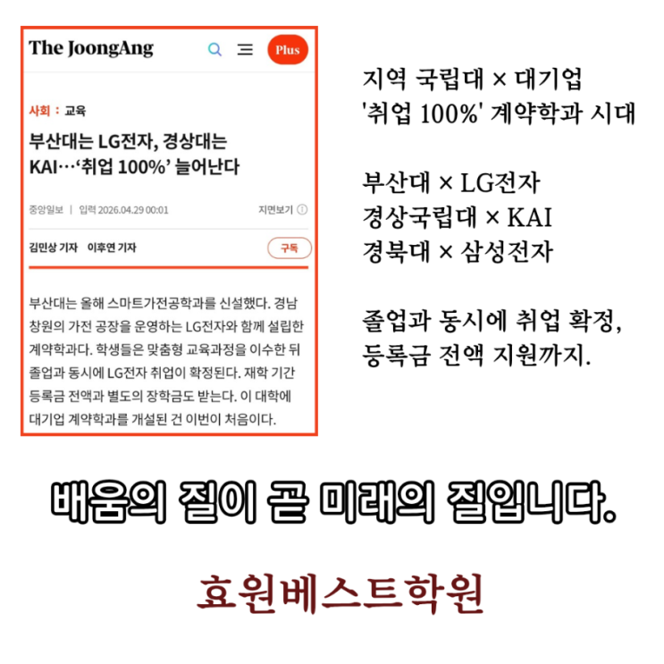 ▪️[교육정보] 지방 거점 국립대, '대기업 취업 보장' 계약학과 열풍! 최근 대학 입시와 취업 시장의 흐름이 변하고 있습니다. 수도권 집중 현상과 인구 감소라는 위기 속에서, 부산대와 경상국립대 등 지역 거점 국립대들이 대기업과 손잡고 '취업 100% 보장'이라는 강력한 카드를 꺼내 들었습니다. ✅ 주요 대학별 신설 및 확대 현황 * 부산대: LG전자와 '스마트가전공학과' 신설 (등록금 전액 및 장학금 지원, 졸업 후 취업 확정) * 경상국립대: KAI(한국항공우주산업)와 우주항공분야 연계 과정 운영 (KAI 입사 보장 및 서울대·프랑스 대학 교류) * 경북대: 삼성전자 채용 조건형 '모바일공학전공'....... <img src="https://blogthumb.pstatic.net/MjAyNjA0MjlfMiAg/MDAxNzc3NDYyNTc2NjEz.MTrQsGV0NQ2AeSliRseVMhbAb757_rD8JXGFSF4vV-Ug.TQkeMPk_ruEXf7fXI3RESWvz45CseO8ykGzNYIyMqTQg.PNG/900_%C1%F6%BF%AA_%B1%B9%B8%B3%B4%EB_%26times%3B_%B4%EB%B1%E2%BE%F7_%27%C3%EB%BE%F7_100%A3%A525%27_%B0%E8%BE%E0%C7%D0%B0%FA_%BD%C3%B4%EB_%BA%CE%BB%EA%B4%EB_%26times%3B_LG%C0%FC%C0%DA_%B0%E6%BB%F3%B1%B9%B8%B3%B4%EB_%26times%3B_KAI_%B0%E6%BA%CF%B4%EB_%26times%3B_%BB%EF%BC%BA%C0%FC%C0%DA_%C1%B9%BE%F7%B0%FA_%B5%BF.png?type=s3" />