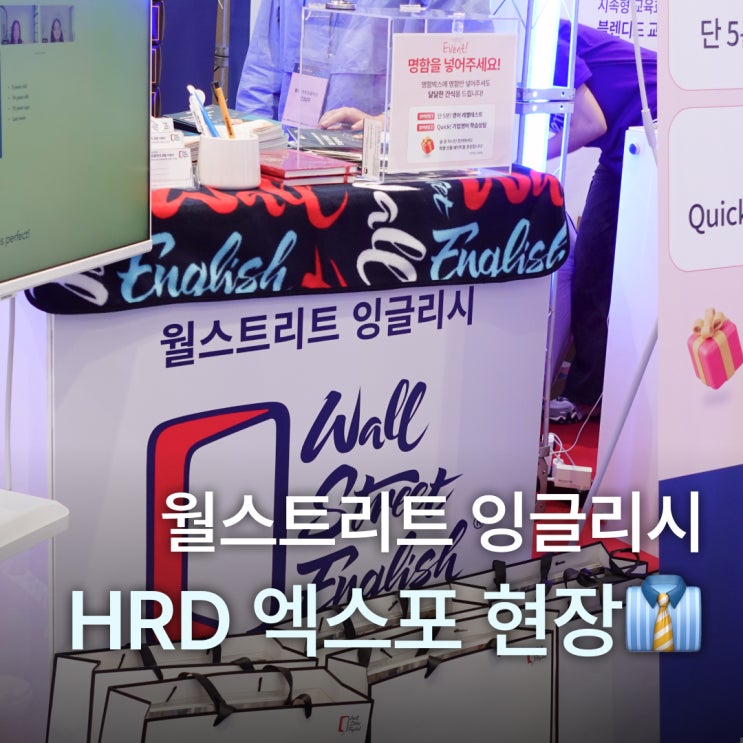 안녕하세요, 월스트리트 잉글리시입니다 지난 4월 22일(수)~23일(목), 월스트리트 잉글리시가 2026 HRD엑스포에 다녀왔습니다! 이번 엑스포에는 국내외 주요 HR 관련 기업들이 한자리에 모였는데요 월스트리트 잉글리시도 16번 부스를 운영하며 정말 많은 분들과 직접 만나는 시간을 가졌답니다! 지금 그 현장을 생생하게 보여드릴게요✨ 평일 오전임에도 불구하고 정말 많은 분들이 HRD 엑스포를 찾아주셨는데요! 데스크에서 성함을 말씀해주시고 입장하시면 다양한 기업들의 부스를 한자리에서 만나보실 수 있었답니다 월스트리트 잉글리시 부스는 과연 어디에 있었을까요? 코엑스 컨퍼런스룸 E홀 3층 Track 5, 16번 부스....... <img src="https://blogthumb.pstatic.net/MjAyNjA0MjhfMjcg/MDAxNzc3MzY3MzQyNDE1.nfzZgDX7kXYiLmJBEC91jRWQyIPE9AcCjnZ3PAjyoQgg.9hJu_50DIYIVRRhd12nURjfDPbkYu2sytrJcbXh3F7Ug.JPEG/Frame_1000002513.jpg?type=s3" />