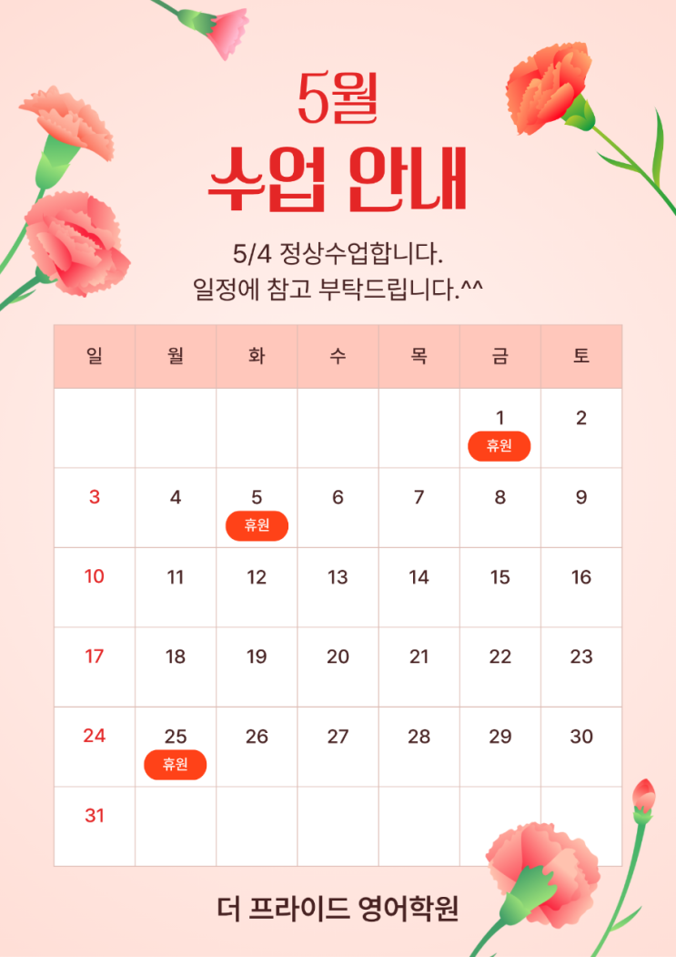 화명동 초등 중등 고등 영어학원 더 프라이드 5월 휴원일 안내