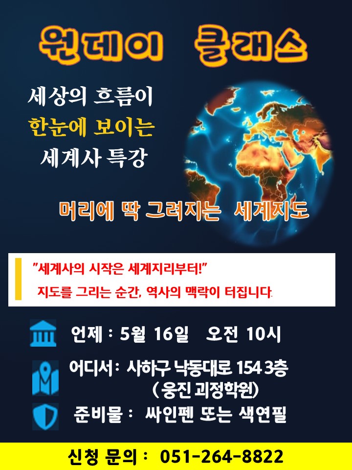 <오는 5월 세계사 특강 안내드립니다> 중학교 2학년이 되면 아이들이 가장 당황하는 과목 중 하나가 바로 세계사입니다 “나라 이름이 너무 많아요…” “위치가 머리에 안 들어와요…” “내용이 연결이 안 돼요…” 이런 말, 한 번쯤 들어보셨을 거예요 ❗ 왜 세계사가 어려울까요? 많은 아이들이 세계사를 ‘외워야 하는 과목’이라고 생각합니다 하지만 실제로는 위치(지리) + 흐름(역사) 이 함께 연결되어야 이해가 되는 과목입니다 예를 들어 유럽, 중동, 아시아의 위치가 헷갈리면 전쟁이나 문화의 흐름도 이해하기 어렵습니다 즉, 지리를 모르면 세계사는 외우는 공부가 됩니다 그래서 먼저 “세계....... <img src="https://blogthumb.pstatic.net/MjAyNjA0MzBfMzAw/MDAxNzc3NTUzMzE4NjUw.ccBCOZa06cJdvTC8WwZVc3hpAbPanQ4maf7O06hKBJ8g.HfRKTZNZy4xQBTgGPOljLicc95ufAfrlSldE51Xvh0Ig.JPEG/1777552282108.jpg?type=s3" />