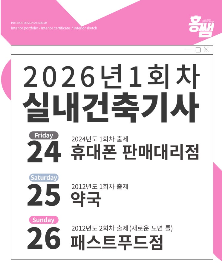 2026년도 실내건축기사 1회차 4월24일 금요일 시험 "휴대폰판매대리점" 복원완료 2026년도 실내건축기사 1회차 4월25일 토요일 시험 "약국" 복원완료 2026년도 실내건축기사 1회차 4월26일 일요일 시험 "패스트푸드점" 복원완료 2026년도 실내건축기사 1회차 금,토,일로 나눠져서 시험이 시행되었습니다. 실기 과년도 문제 복원해서 업로드 공유드립니다! 컴퓨터로 시험방식이 바뀐후 첫시험 난이도가 손제도때보다 훨씬 올라갔으며 홍쌤도 생각했던 단면도에서 난이도를 높일거라고 생각했는데 역시나 단면도에서 합격유무를 가르기위해 난이도가 어렵게 나왔으며, 특히나 약국 단면도가 난이도가 상으로 나왔습....... <img src="https://blogthumb.pstatic.net/MjAyNjA0MjhfMjI0/MDAxNzc3Mzc1NDIwMDMw.MglSfhgwR-v9YAo2oTX3thD-c6CTuy2giQ1LoouVoiYg.vvwoX07m6VVH7vjDRsQvyg0ac6f6jY3VXhWj5ilQJFYg.JPEG/%B4%EB%C1%F6_6.jpg?type=s3" />